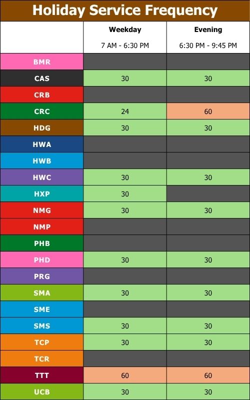 Route frequency is decreased during Holiday Reduced Service. BMR, CRB, HWA, HWB, NMP, PHB, PRG, SME and TCR are not in service