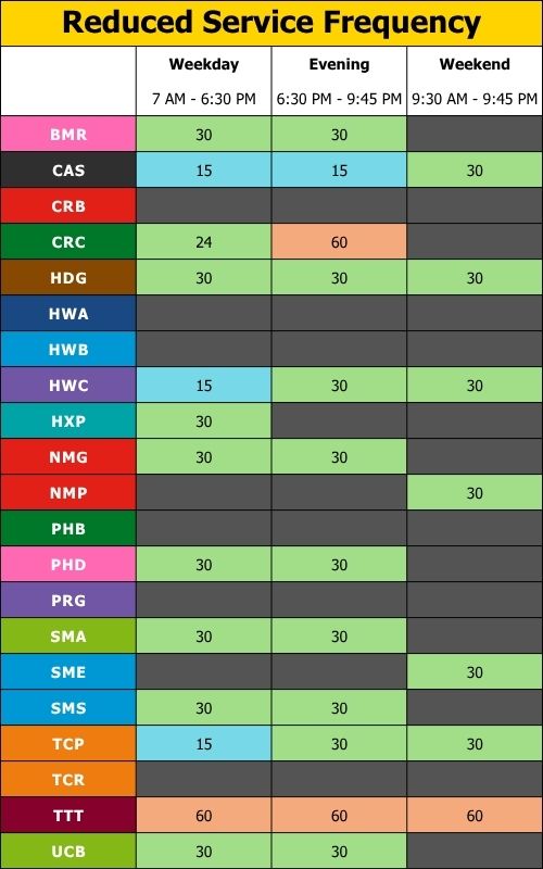 Route frequency is decreased on most routes during Reduced Service. CRB, HWA, HWB, PHB, PRG and TCR are not in service.