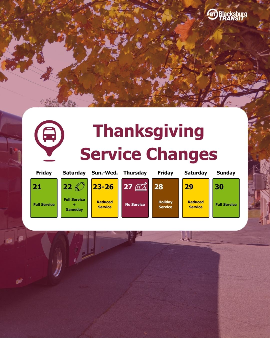 BT is operating on Reduced Service Sunday, 11/23 – Wednesday, 11/26. There is no service in Blacksburg or Christiansburg on Thanksgiving Day, 11/27. BT will operate on Holiday Reduced Service on Friday, 11/28 and will be back on Reduced Service on Saturday, 11/29.