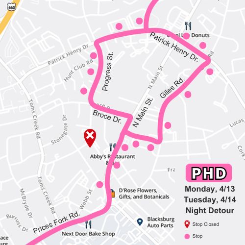 PHD will detour Monday, 4/13 and Tuesday, 4/14 from 11:45 PM to the end of service each night due to construction.
