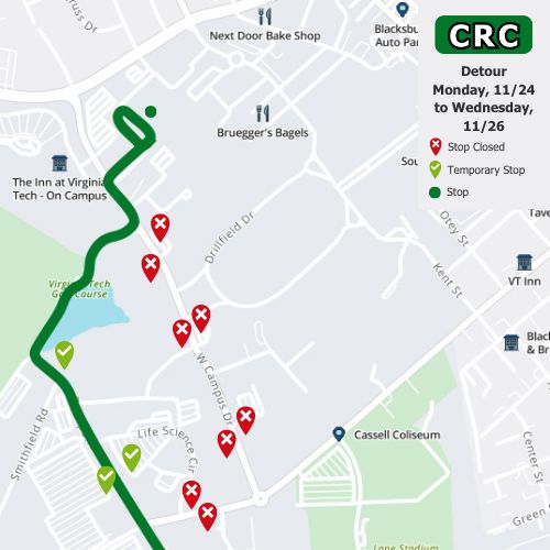 Corporate Research Center (CRC) will not service all stops on West Campus and Washington.